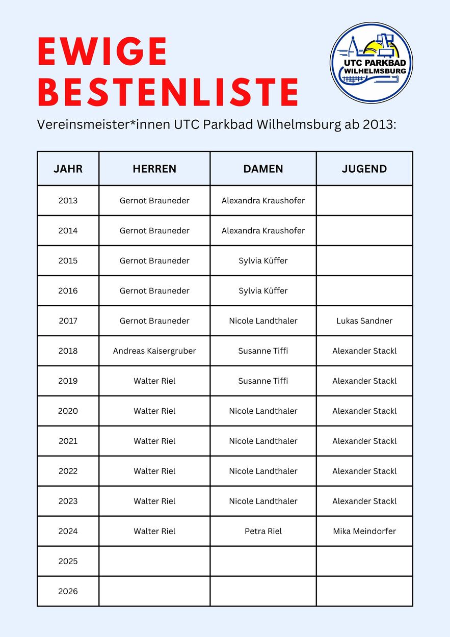 Eine Übersicht aller Vereinsmeister:innen seit Anbeginn des Bewerbs findest du hier:
